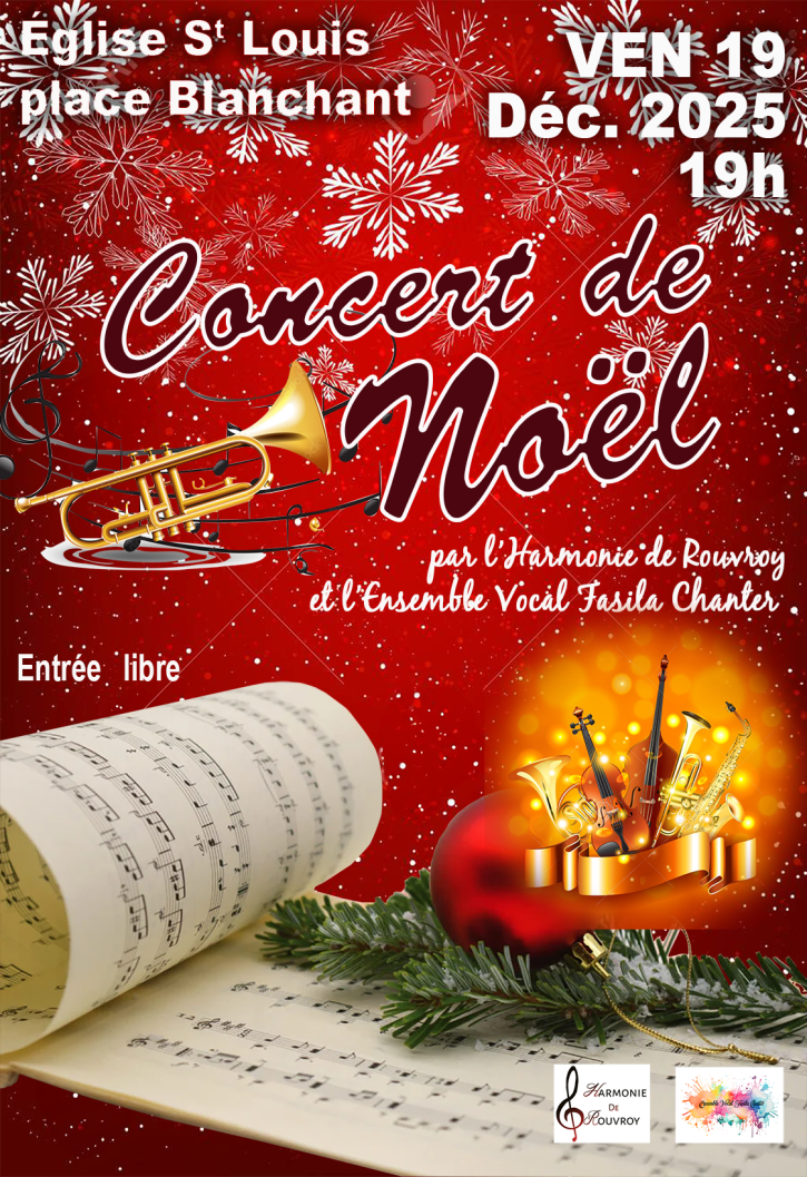 L'harmonie de Rouvroy et l'Ensemble vocal Fasila Chanter proposent un concert de Noël, le vendredi 19 décembre à 19h, église St Louis, place Blanchant. Ouvert à tous. Gratuit. Avec ou sans réservation.