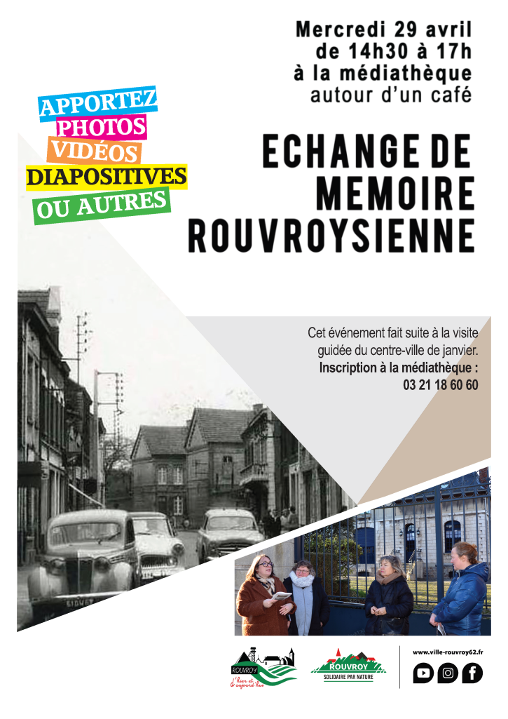 Cet événement organisé en partenariat avec l'association "Rouvroy d'hier et d'aujourd'hui, fait suite à la visite guidée du centre-ville du mois de janvier pendant les nuits de la lecture « Ville et campagne ». Il fait appel à vos souvenirs, à partir de la collecte de photos, diapositives, des documents divers en lien avec l’histoire locale de Rouvroy. Il s'agit de partager des souvenirs autour d’un temps convivial entre habitants.