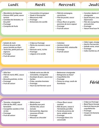 Retrouvez les menus de la cantine scolaire Retrouvez ici le règlement intérieur de la cantine scolaire : reglement_interieur_de_la_cantine_scolaire Téléchargement Taille : 206.47 Ko Extension du fichier : pdf Publié le 04 Oct. 2022 Année 2026 : Cantine 27 avril > 19 juin Cantine 27 avril > 19 juin Téléchargement Taille : 551.51 Ko Extension du fichier : pdf Publié le 03 Avr. 2026 Cantine mars > avril Cantine mars avril Téléchargement Taille : 823.83 Ko Extension du fichier : pdf Publié le 19 Fév. 2026