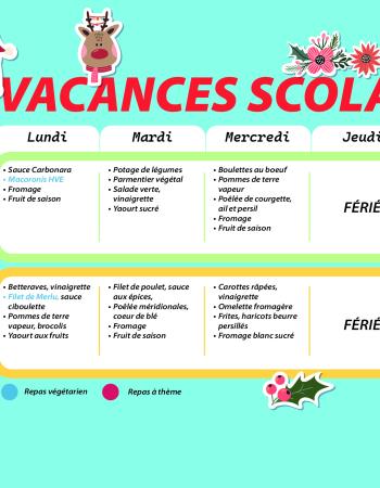 Retrouvez les menus de la restauration pour le centre de loisirs Année 2025 Décembre / janvier : Semaines du 22 décembre au 02 janvier 2025 Vacances scolaires 22 dec 02 janv.pdf Téléchargement Taille: 9.35 Mo Extension: pdf Publié le 17 Nov. 2025