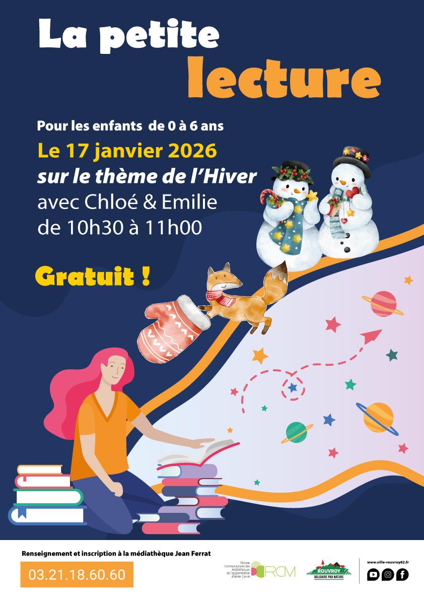 La petite lecture, destinée aux enfants de 0 à 6 ans est programmée le 17 janvier 2026 de 10h30 à 11h et portera sur le thème de l'hiver.