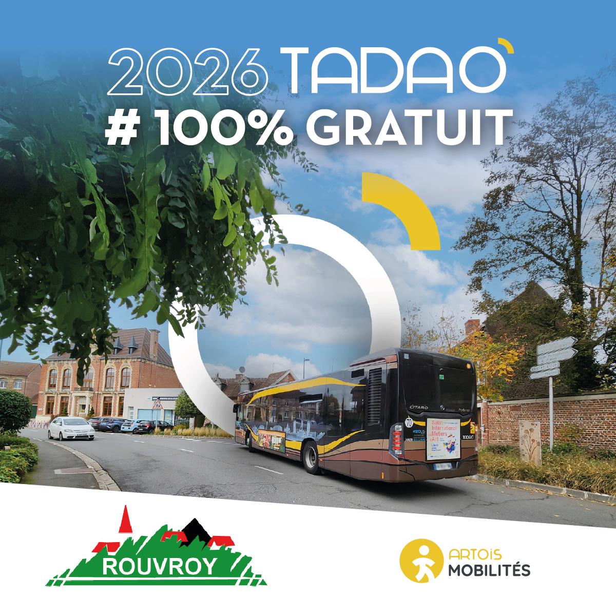 Dès le 1er janvier 2026, vous pouvez monter dans un bus TADAO sans aucun titre de transport ni abonnement. Le réseau TADAO devient entièrement gratuit. Que vous soyez habitants du territoire ou simple visiteur de passage, vous montez et descendez où bon vous semble aussi souvent que cela vous chante.
